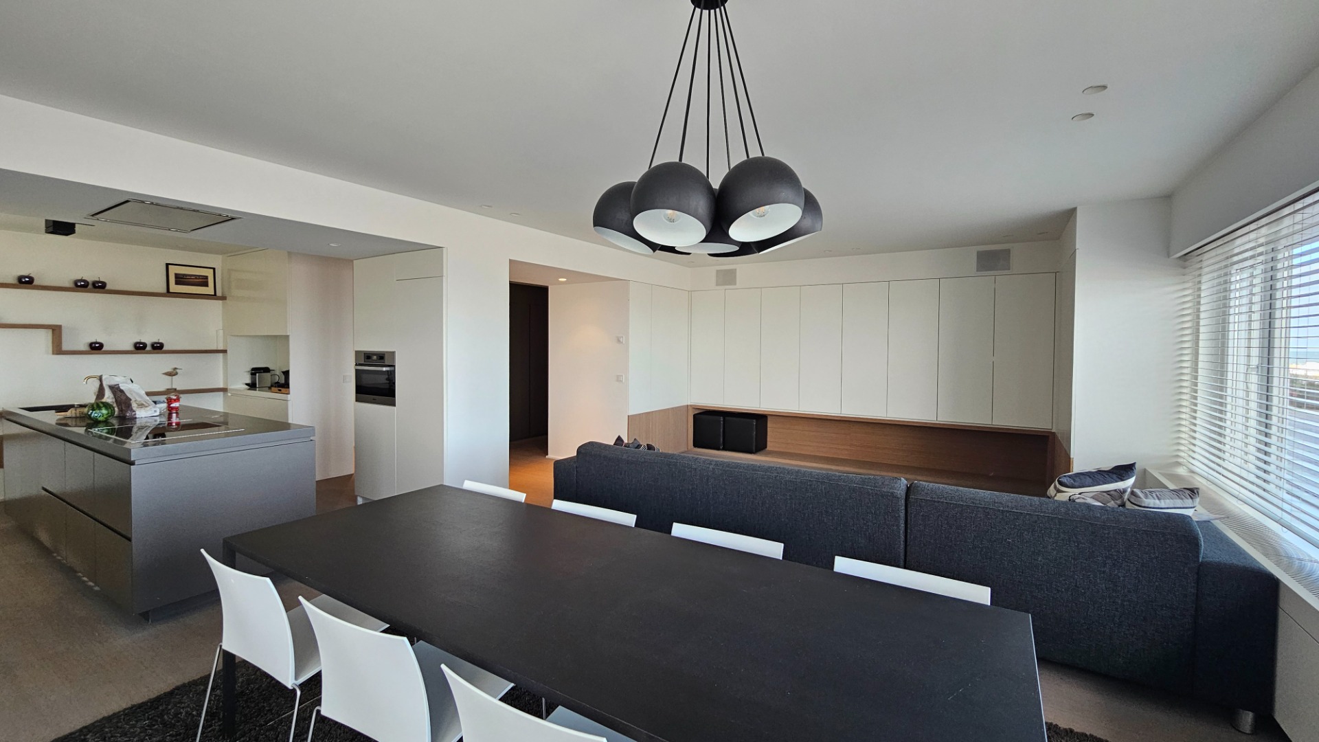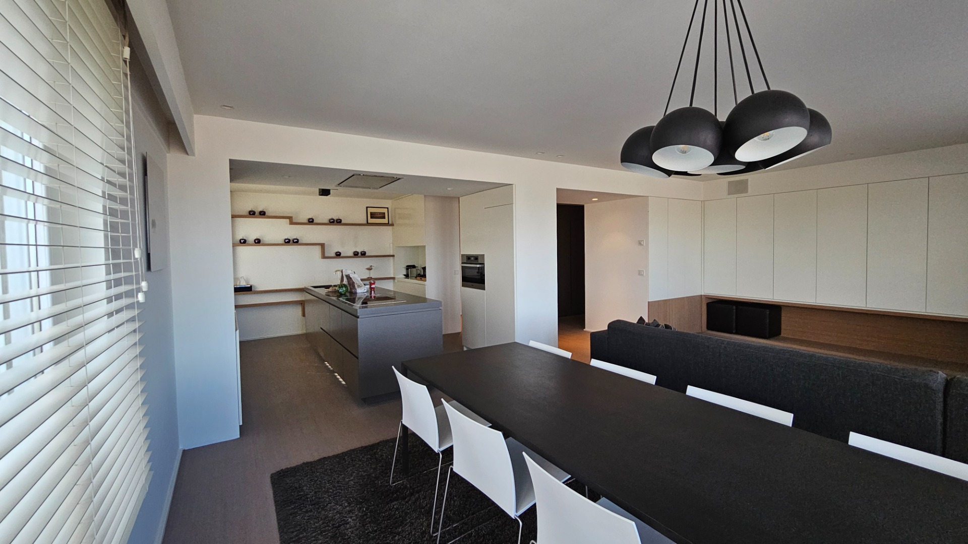 Het appartement is stijlvol afgewerkt met volledig doorgelegde bamboe parketvloeren, een moderne, ingerichte keuken, ruime leefruimte met panoramisch zeezicht, Nike HomeControl domotica voor een geavanceerd wooncomfort, en een luxueuze badkamer met inloopdouche. Bovendien beschikt het appartement over een ruime kelder en is er een privéparkeerplaats inbegrepen in de prijs.